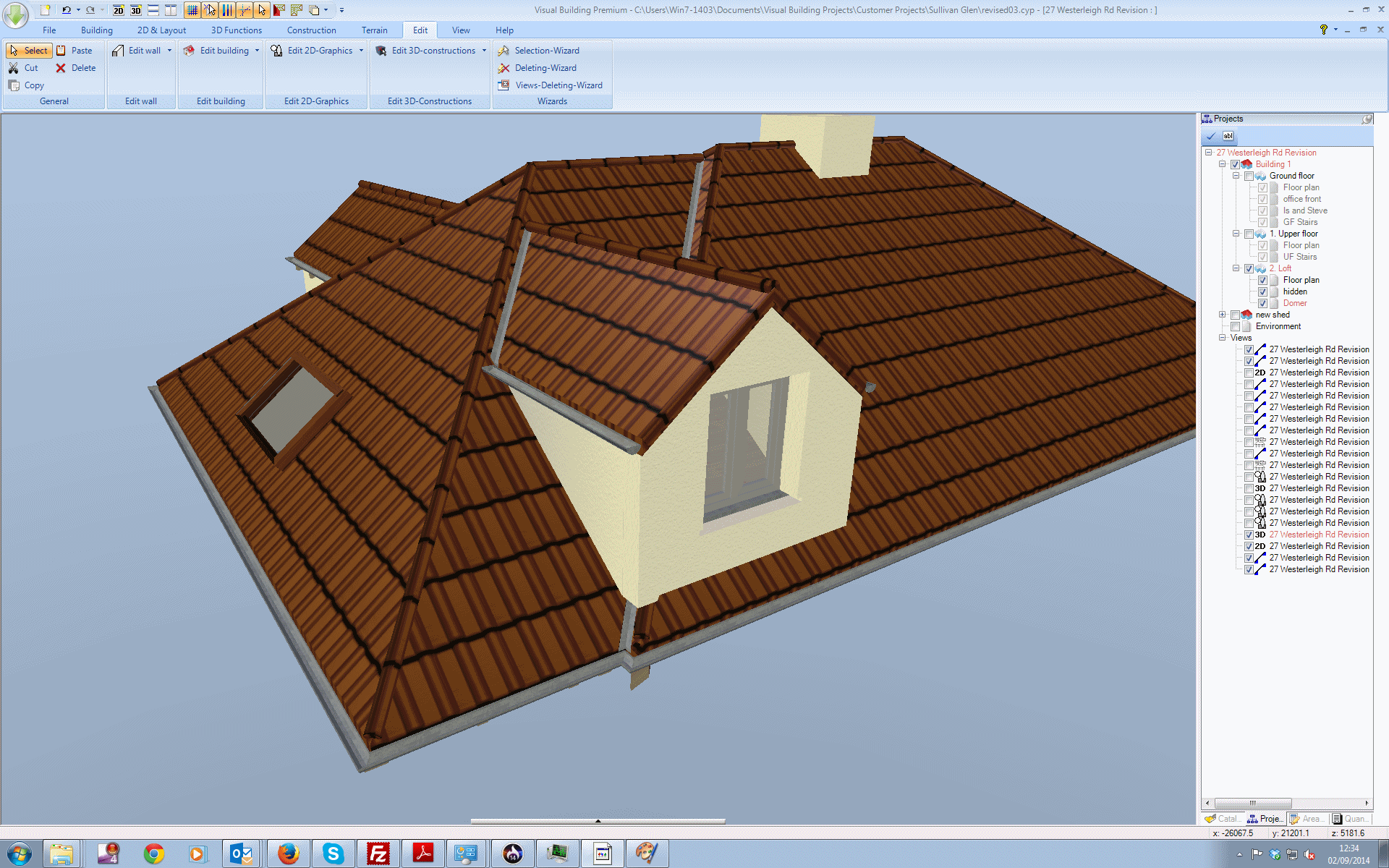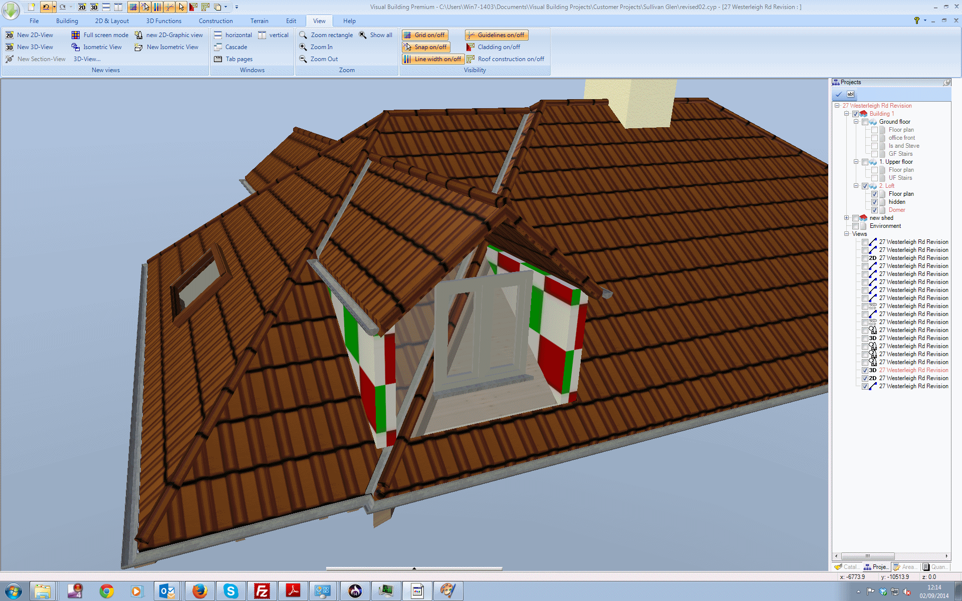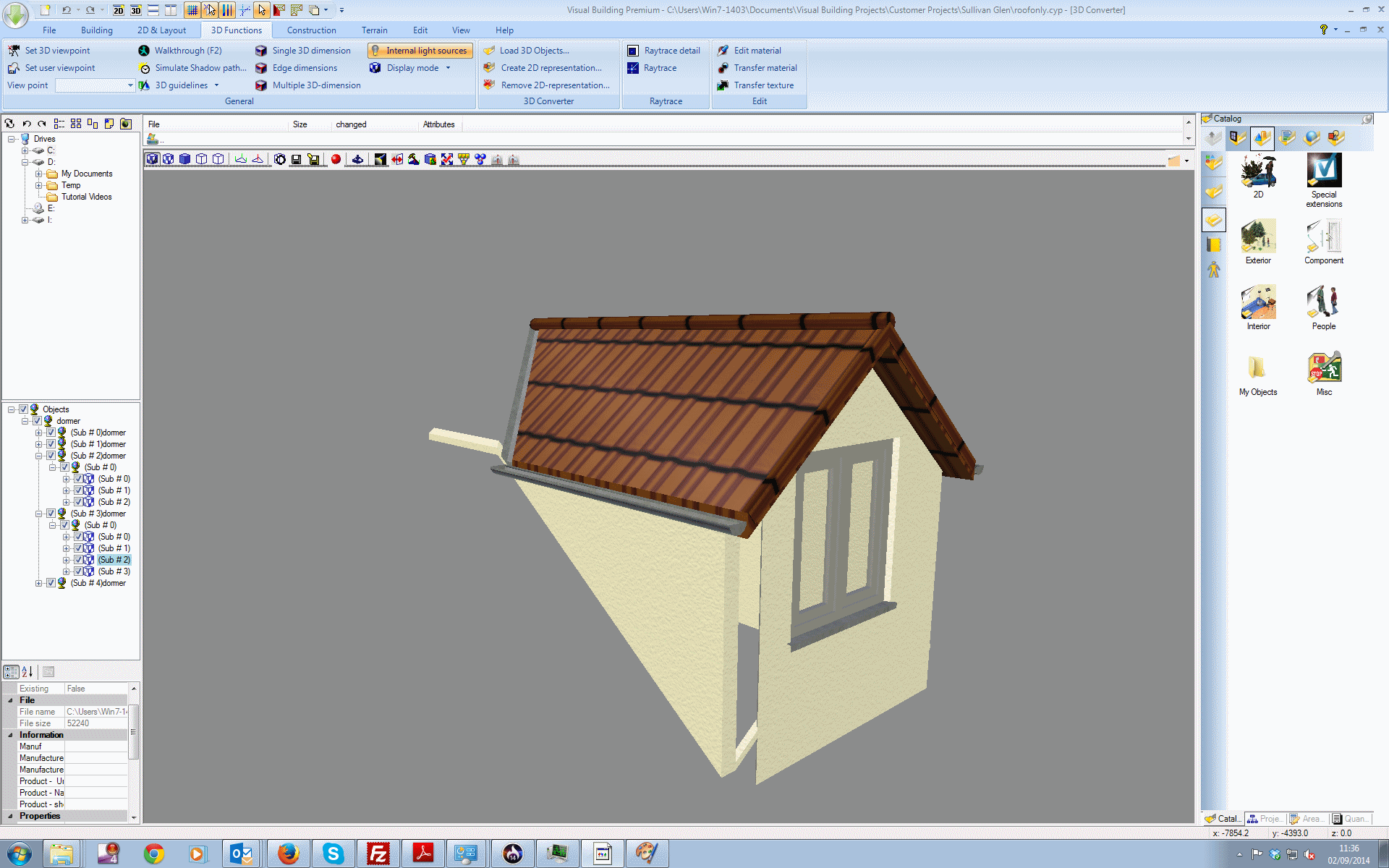 First I created a temp copy of your project and deleted all layers except for the roof. On the Loft I used the Visibility options to hide all other features so that I was left with just this: I then deleted the other dormer: I then used Export - 3D Format - 3D Object to export the remaining dormer as a .cyg object I then used the 3D Converter Tool to load the saved dormer .cyg object I then removed the elements of the dormer that I did need, by deselecting them in the Objects tree I found that in this case that, meant all the walls. Sometimes you can keep the walls, but this depends on the problem. Select the unwanted object in the 3D view ansd deselect it in the tree. I then saved this as a .cyg object. This object now only contains the elements visible. I then reloaded the main project, into which I loaded the new edited dormer object. Using the Move and Move with reference tools I placed the new dorme object. These tools are in the Selection tab Move group. Note that the selection tab only appears when you have an object selected. I then used the 2D Polygon tools to create the wall outline to fit the roof slope in the elevation view. Use 2D & Layout tab - 2D Drawing functions - Polygon - Closed Polygon tool. Using the Construction - Extrude solid - 2D contour I created a solid wall from the 2D outline just created. The default thickness is 1m so this has to be reduced- in my example I reduced this to 200mm. You can then use Multi copy to copy the wall to other side of dormer. The wall will need to be posisioned correctly in the plan view, using the Move with reference tool. Repeat with a front elevation for the front wall. Extrude a hole for the window using the Edit 3D Constructions boolean difference You can then manually cut a hole in the roof, because the roof does not recognise this object as a dormer. This method demonstrates how you can use the 3D editing tools to replace any created object. Applicable to Visual Building Professional / Premium. |