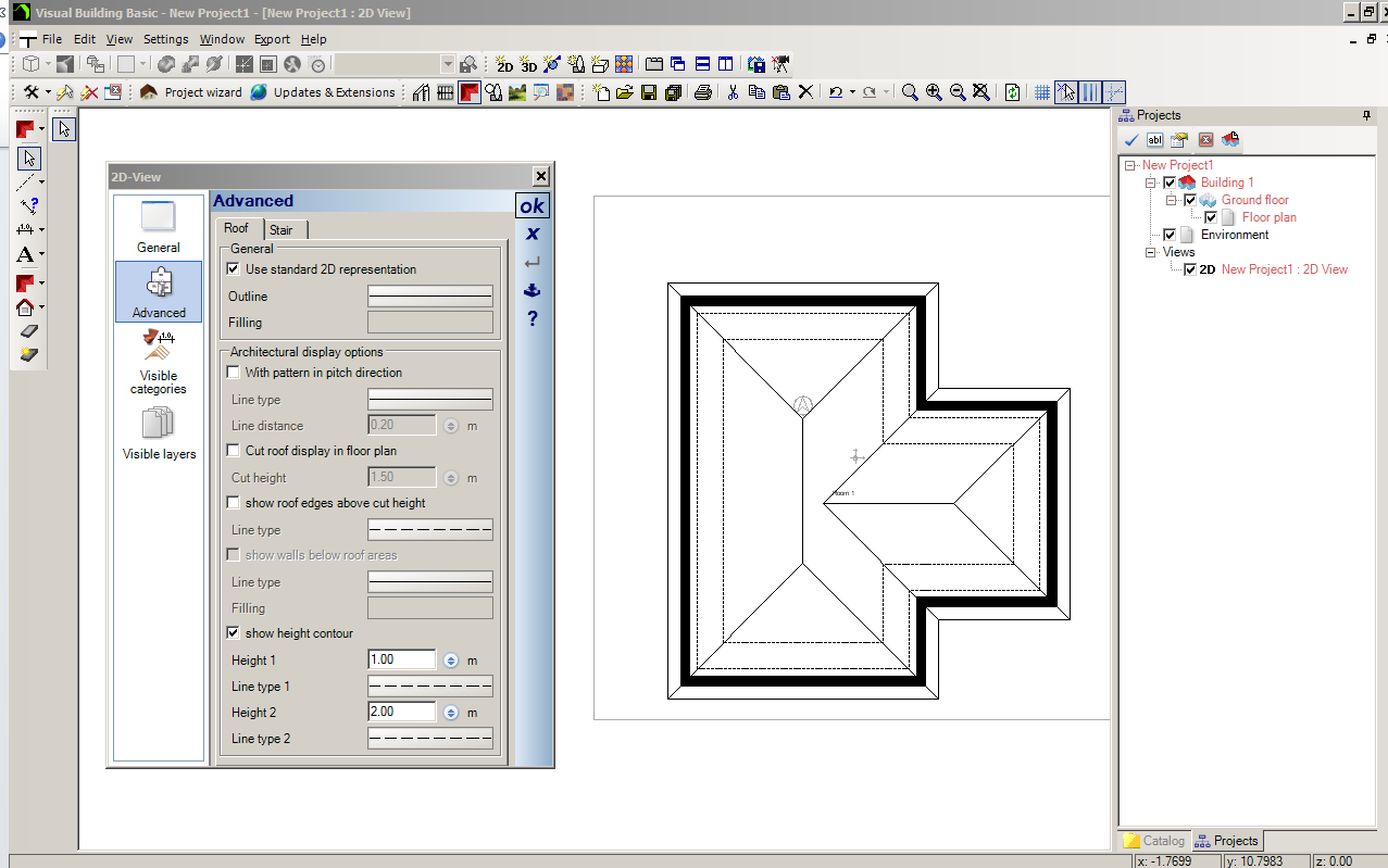 The 2D View Properties dialog will then display. Select the Advanced tab, and at bottom of dialog select Show Height contour. You can select the heights that you want the contour to display at, and also the line style to show in the 2D plan. Height contours are of special interest to those concerned with an attic conversion or extension, as it gives you a better understanding of the useful living area under a pitched roof. This a useful dialog to know about if you want to change how your roof looks in the 2D view, allowing you to hatch it or fill it with colour. |